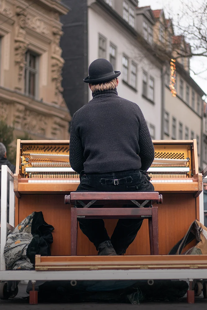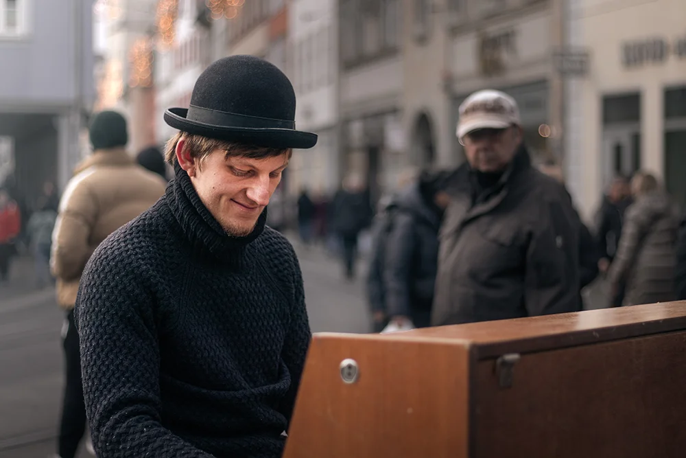 Der Fokus lag auf Ausdruck und Atmosphäre. Das Schwarzweiß-Porträt bringt Nähe und Charakter, während die Farbbilder die Umgebung einbeziehen. Warme Lichter im Hintergrund, kühle Luft, Bewegung in der Stadt. Die Details wie Hände auf den Tasten, Struktur im Pullover oder das alte Holz des Klaviers erzählen leise mit.